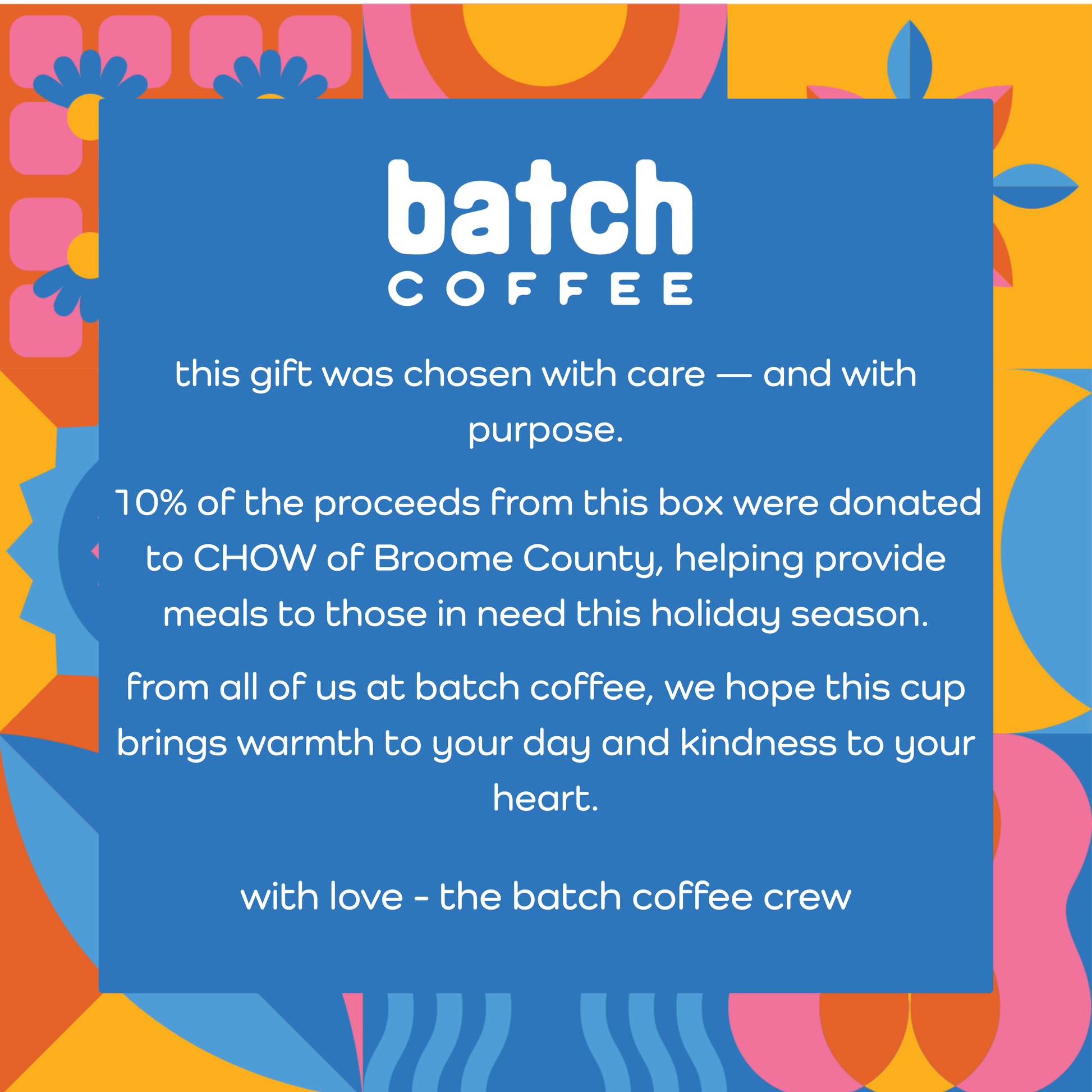 Give the gift of warmth, flavor, and goodwill this holiday season. Each box includes two 12oz bags of freshly roasted Batch Coffee, a branded mug and stickers. 10% of gift box proceeds are donated to CHOW of Broome County to help feed local families in need.